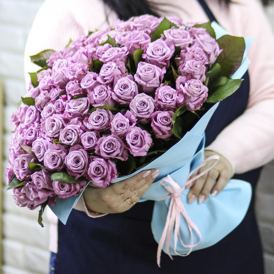 На фото букет из 101 фиолетовой розы. В составе: роза 101 шт, фоамиран 2 шт, атласная лента 1 шт, . Все цветы свежие и ароматные, букет красиво оформлен и отлично подходит для подарка. Доступна доставка цветов или самовывоз.