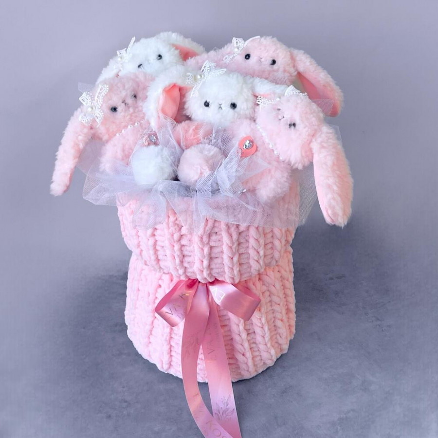 На фото букет из игрушек «плюшевые зайки». В составе: . Все цветы свежие и ароматные, букет красиво оформлен и отлично подходит для подарка. Доступна доставка цветов или самовывоз.