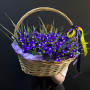 Лента атласная - 2 шт. Корзина плетеная - 1 шт. Открыточка с вашими пожеланиями - 1 шт. Оазис флористический - 1 шт. Ирис фиолетовый - 101 шт. инструкция по уходу за цветами - 1 шт. хорошее настроение - 100 шт.